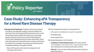 Navigating electronic prior authorization (ePA) requirements can be a major blind spot for biopharmaceutical teams, especially in rare disease therapies where coverage criteria are often unclear, inconsistent, or difficult to access. In this case study, we explore how Policy Reporter and Valeris Hub worked together to bring clarity to a fragmented landscape by consolidating ePA question sets, payer policies, and prior authorization forms into a single, structured source of truth.